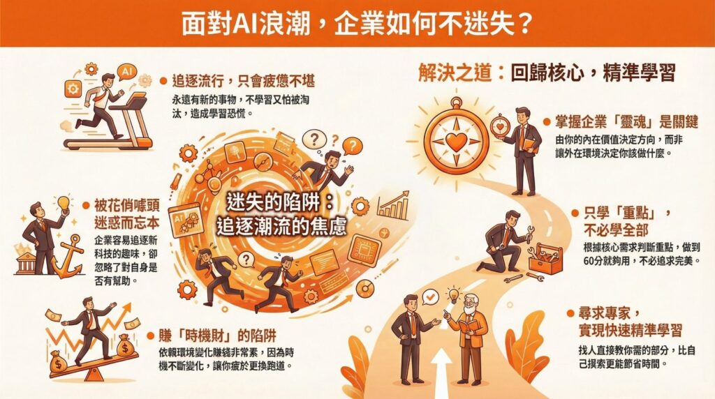 一個對於新科技焦慮的人,往往認為我什麼都要學!看到新技術一直在推陳出新,我不懂、我就落伍了…這樣的焦慮一直讓人產生學習恐慌!也讓企業追逐新科技過程持續迷失,我不否定有人依賴環境變化在賺時機財,但你會非常疲憊,因為時機會一直變化萬端,確實掌握時機財可以大撈一筆,但很快你就會發現你一直在更換、你很累、你疲憊不堪!